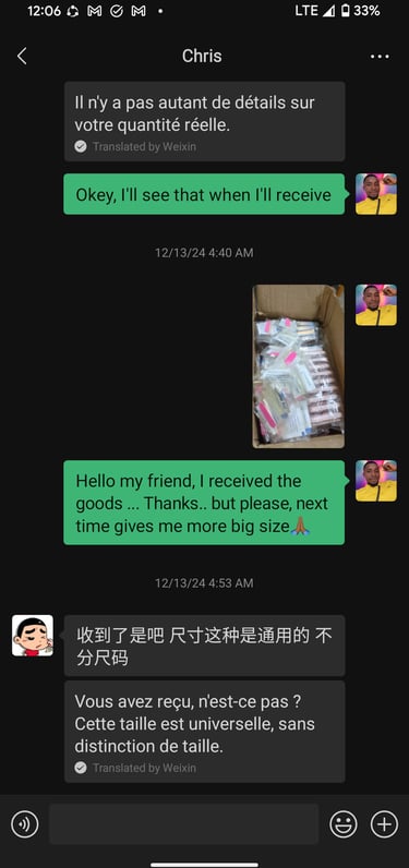 Vous l'aurez remarqué, avec l'application whatsapp chinoise, c'est possible que vous écriviez en français ou anglais, et il reçevra dans son téléphone en chinois, et lorsque le fournisseur écrit en chinois, vous reçevez en la langue de configuration de votre téléphone(le Français).